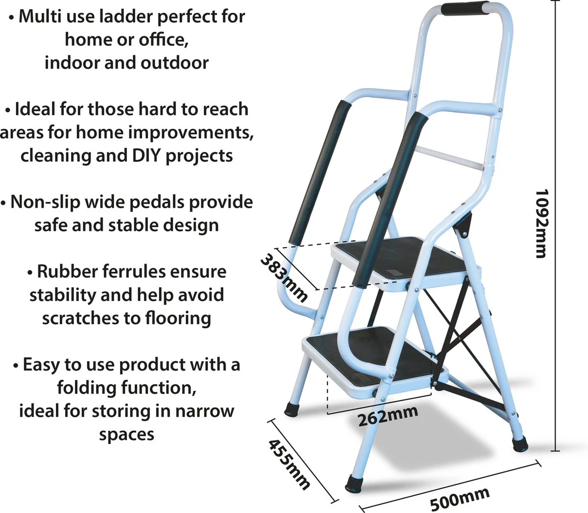 De opstapkruk met leuning is een veelzijdige opstap die zowel binnen als buiten kan worden gebruikt, ideaal voor schoonmaken, het uitvoeren van huisrenovaties, doe-het-zelf-klussen en het bereiken van moeilijk bereikbare plaatsen. Het opvouwbare ontwerp zorgt voor eenvoudige opslag en past op smalle plaatsen. Het lichtgewicht en dichte ontwerp zorgen voor gemakkelijk vervoer tijdens het gebruik. Deze trapladder heeft een veilig en stevig ontwerp. De antislip brede pedalen geven gebruikers een evenwichtig gevoel, en de rubberen hulzen beschermen uw vloer tegen krassen en verminderen de kans op uitglijden. De rubberen leuning zorgt voor extra grip. Verkrijgbaar als 2 of 3 treden model.
