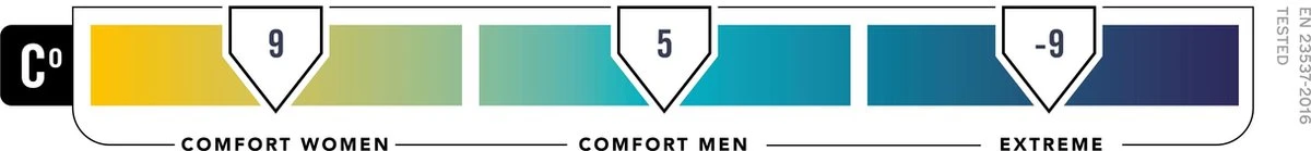 Voor vrouwen ligt de comforttemperatuur rond de 9°C, voor mannen is dat 5°C. Gebruik deze slaapzak nooit in temperaturen lager dan -9°C.