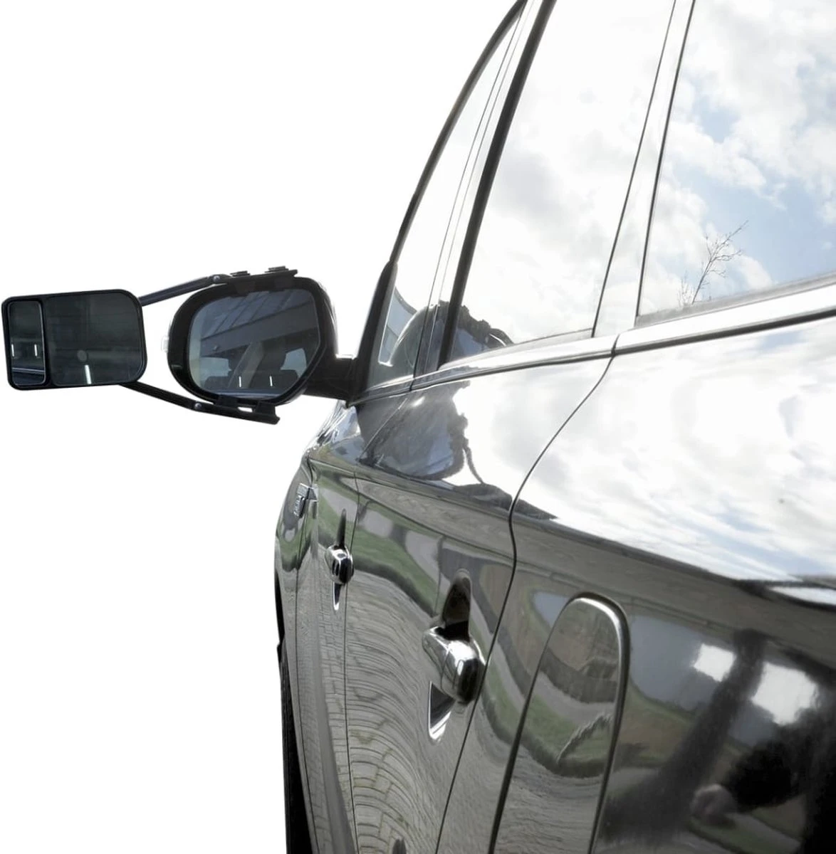 - Wordt op bestaande spiegel geklikt en is geschikt voor grote autospiegels als campers, bestelwagens en 4 × 4 voertuigen