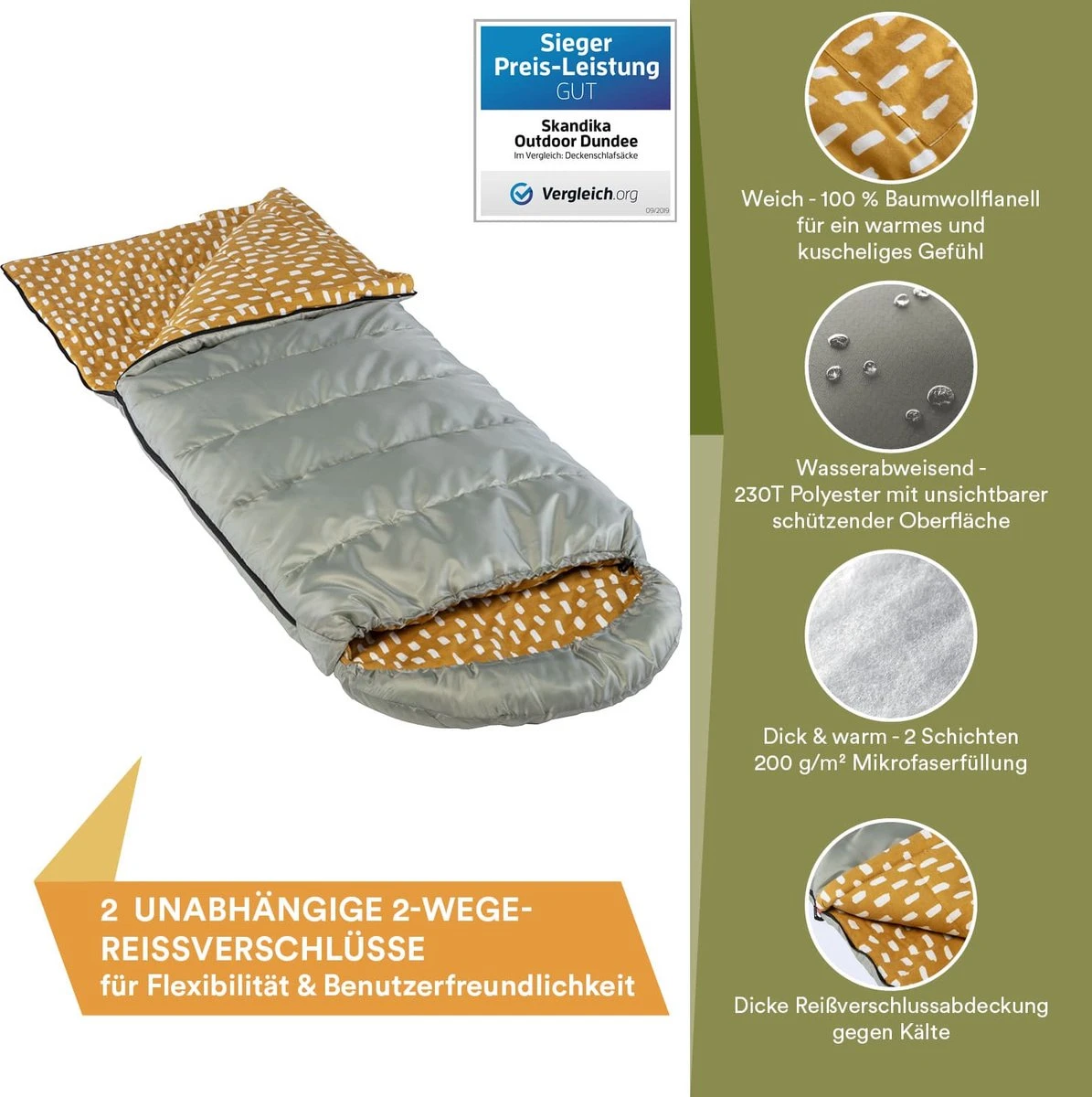 De 2-ritsen met rode knelbeschermkap voor het gemakkelijk openen en sluiten van de slaapzak zonder knellen kunnen zowel van binnen als van buiten worden geopend. De langere ritssluiting heeft bovenaan een klittenbandsluiting om te voorkomen dat de ritssluiting uit zichzelf opengaat. Voor thermische isolatie is er een dik stoffen paneel langs beide ritsen aan de binnenkant. Bij mildere temperaturen kan de kortere ritssluiting aan het voeteneind afzonderlijk worden afgeritst, zodat de voeten een beetje verkoeling krijgen. Als beide ritssluitingen worden geopend, kan de slaapzak worden uitgespreid tot een grote deken.